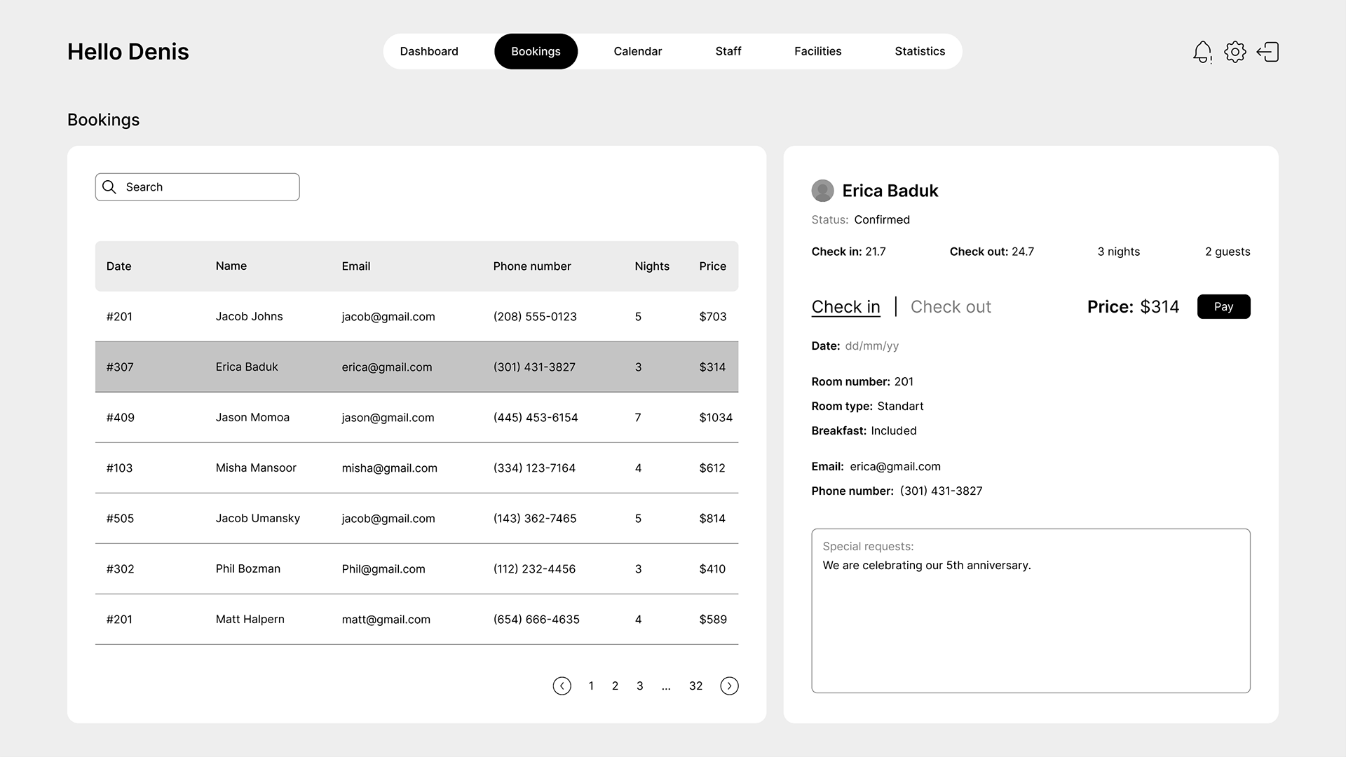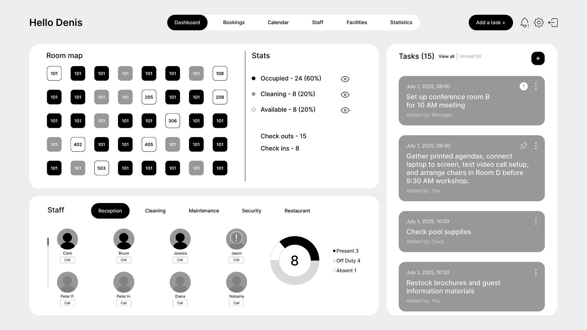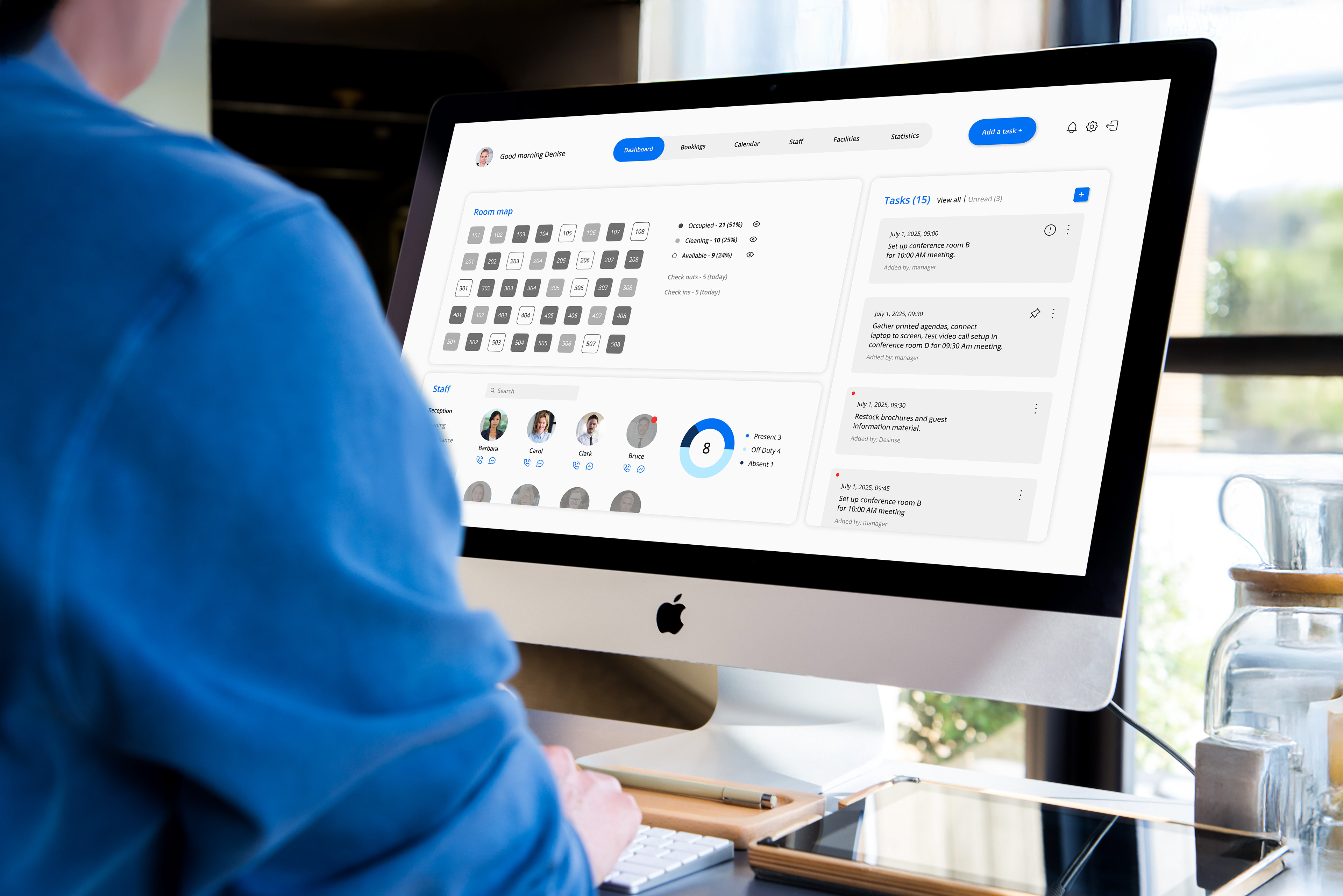 I created a B2B hotel management system, designed and developed specifically for the role of the Shift Manager. The core challenge involved taking a busy brief that is detailing a complex hotel workflows and staff roles and translating it into an effective, streamlined information architecture that will also be user friendly. The thought process centered on prioritizing the most critical information for the user's immediate operational needs, leading to the decision to feature the Room Map, Tasks, and Staff Attendance as the main elements on the dashboard. The actionable process involved initial wireframing, where multiple iterations were sketched, refined, and stripped of unnecessary content to ensure maximum utility. This was followed by defining the visual design, landing on a clean and intuitive system using a simple color palette and selecting the typeface for its high legibility, which was a key requirement for quick reading, even if the user stepped away from the computer.